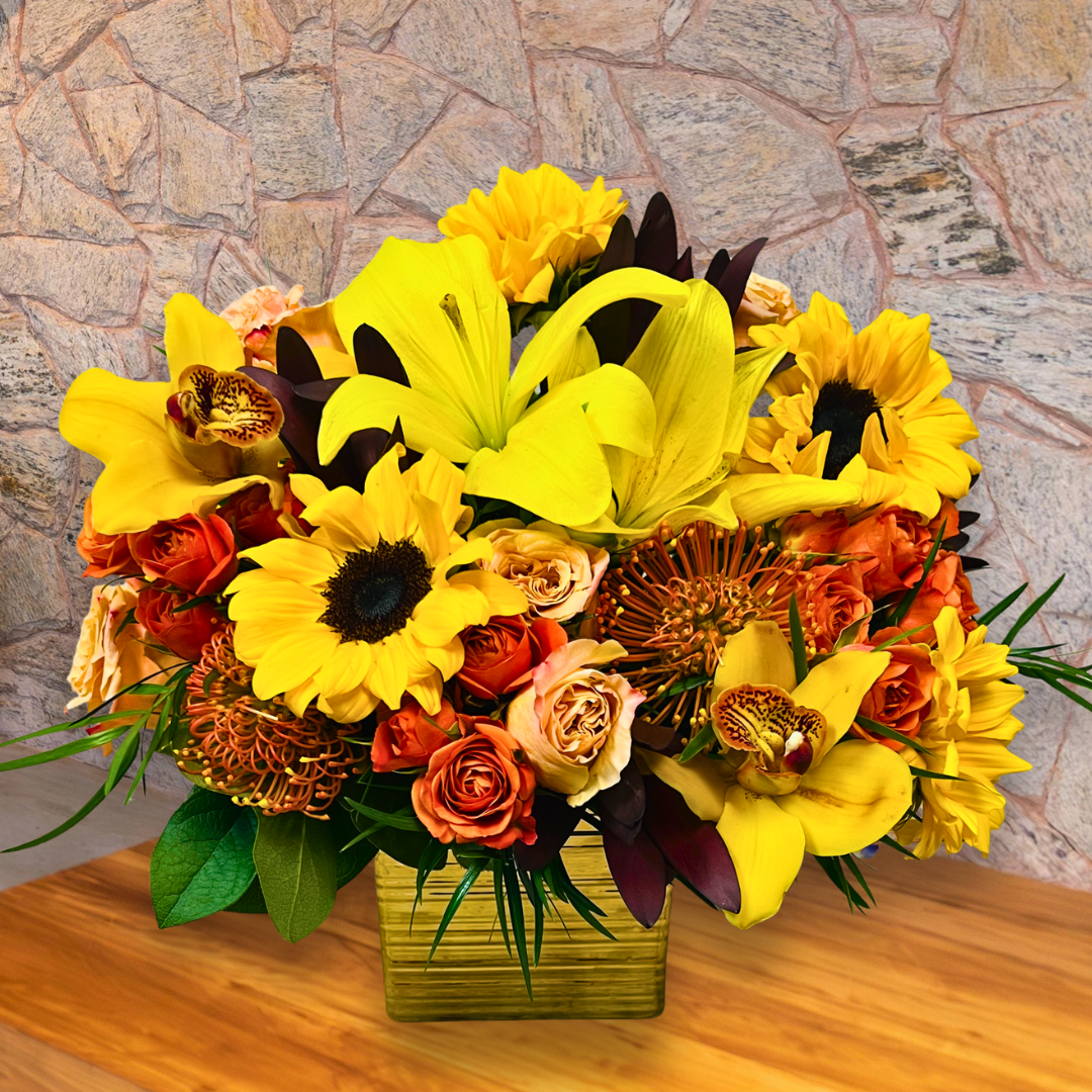 Orange  tea roses and  roses, accompanied by orange Pincushion Protea and rustic brown leucodendron, Sunflowers, yellow lilies, and exotic yellow Cymbidium orchids.