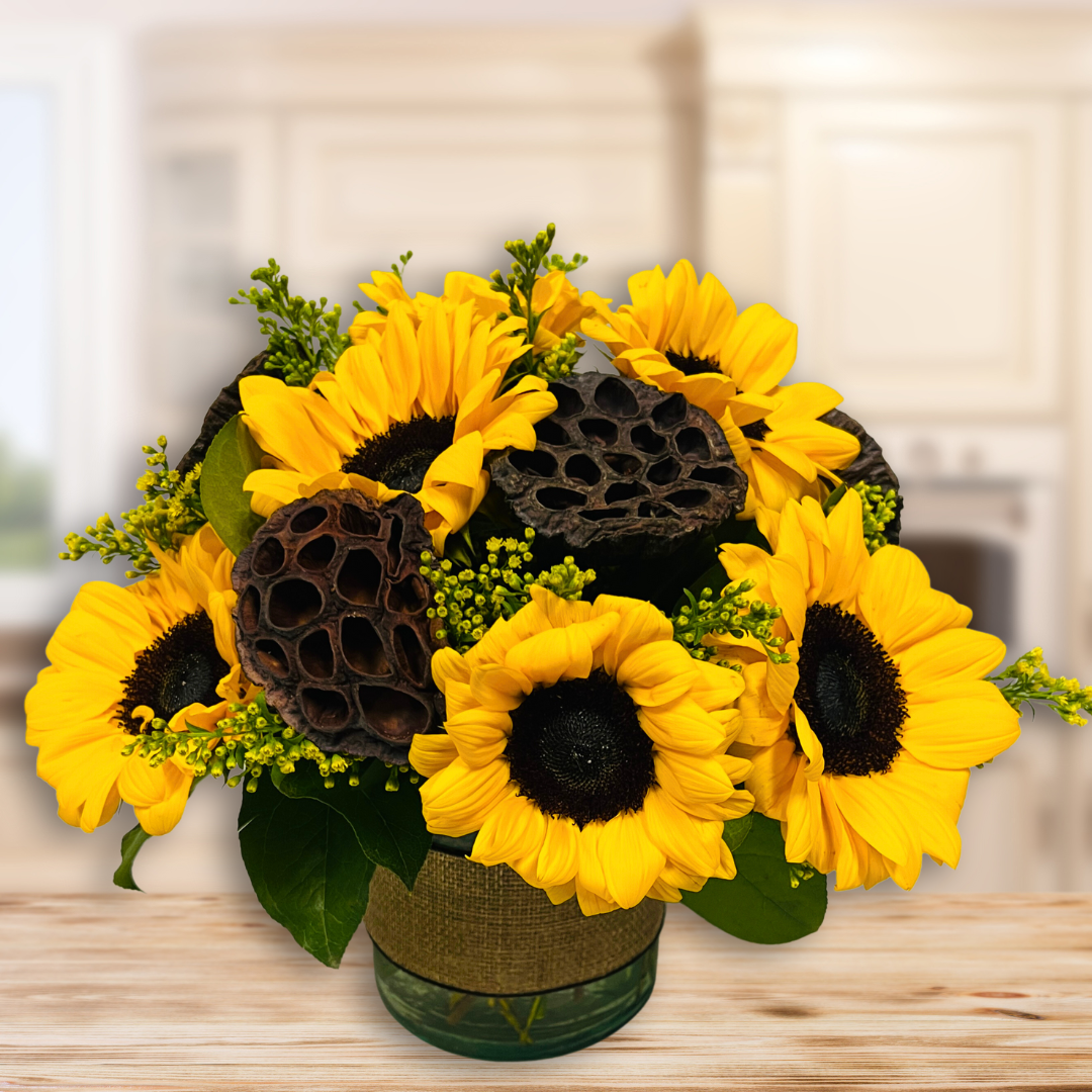 This Sunflower Harvest is a gathering of radiant sunflowers and lotus pods with rays of yellow Solidago peeking through, designed in a cylinder vase that is wrapped with a linen ribbon accenting the natural look of these vibrant Viking Sunflowers and earthy lotus pods.