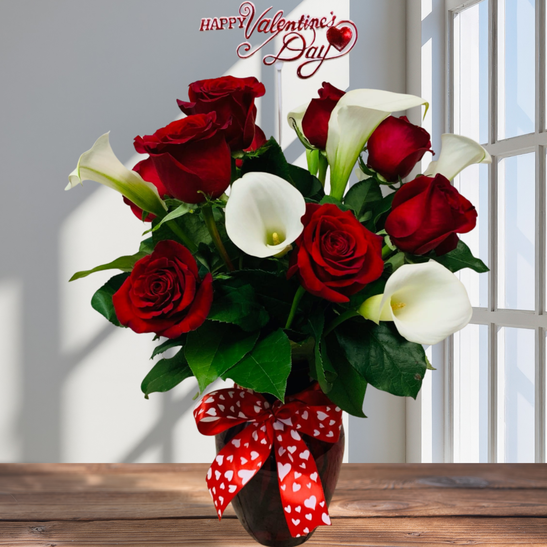 Roses and Calla Lilies with assorted greenery in a red ginger jar.